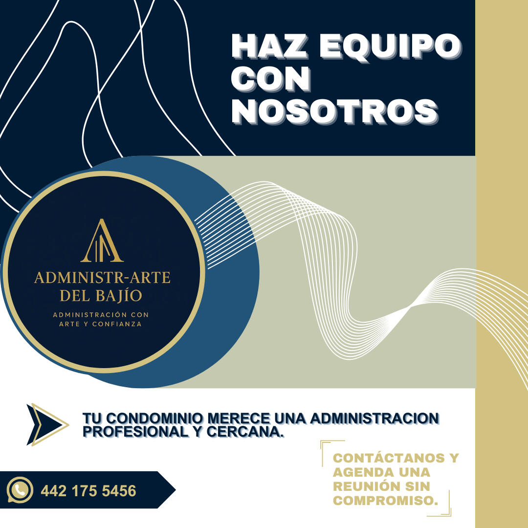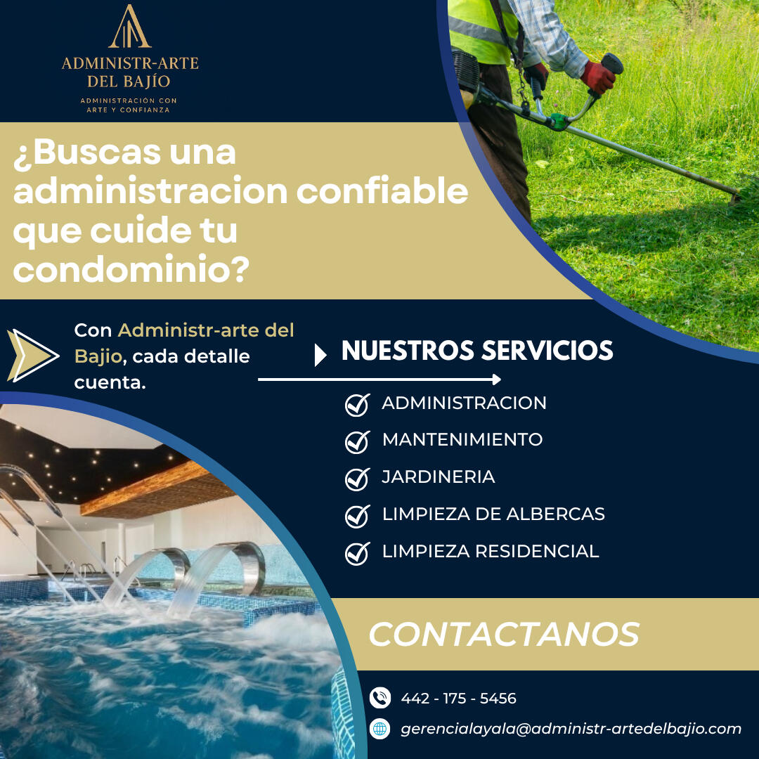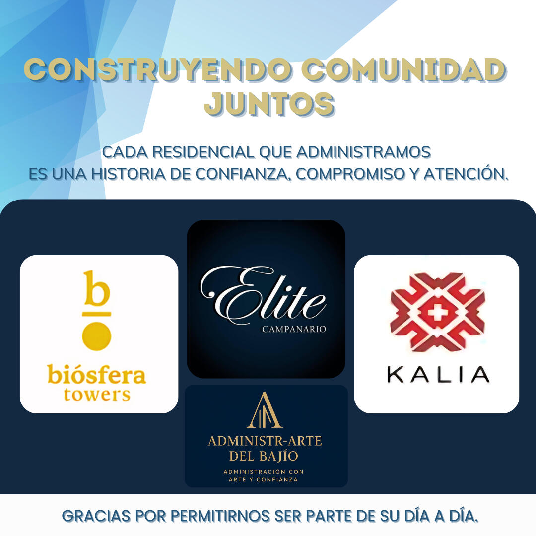 En Administr-arte del Bajío, sabemos que una buena administración es la base para una comunidad armoniosa y funcional.Brindando servicio en Querétaro y alrededores, con más de 5 años de experiencia, somos una empresa con enfoque profesional y humano, especializada en la gestión integral de condominios, tanto verticales como horizontales.Más que administrar, nos involucramos activamente en el bienestar de cada residente, cuidando cada detalle con transparencia, eficiencia y cercanía.Cada residencial que confía en nosotros forma parte de una red de comunidades sólidas, seguras y bien organizadas, donde la comunicación y el compromiso son nuestra prioridad.